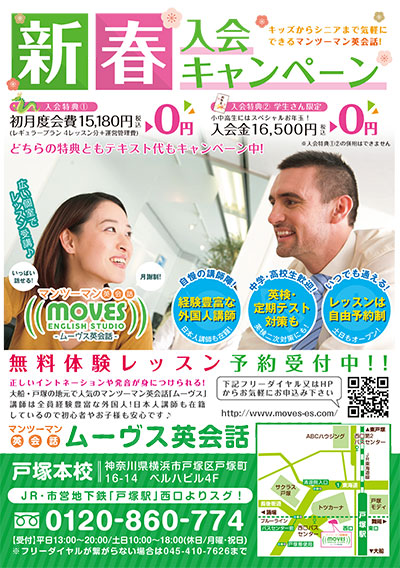 ムーヴスの基本的な運営ポリシーは「通いやすい、続けやすい、だから上達する」です。それをとことん追求するために、負担が少ない月謝制とともに、既存の大手英会話スクールの料金に比べ、約半額またはそれ以下という驚きの価格体系でレッスン・サービスを提供致します。